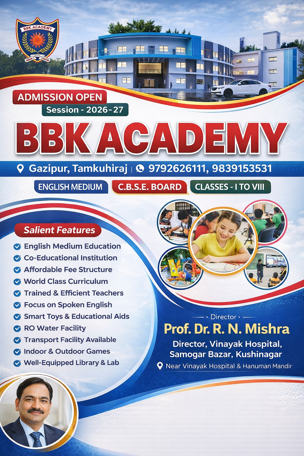 BBK Academy, Gazipur (Tamkuhi Raj, Kushinagar) is a reputed educational institution established with a strong commitment to providing quality and value-based education in the region. Our aim is not only to impart academic knowledge but also to nurture students into disciplined, self-reliant, morally strong, and responsible citizens who can contribute meaningfully to society and nation-building.
